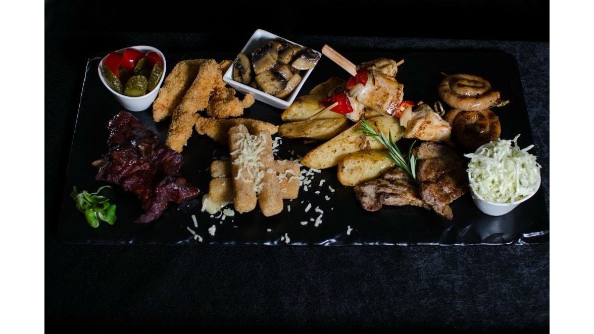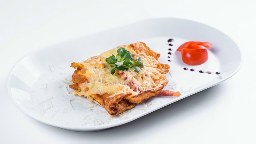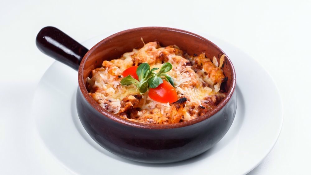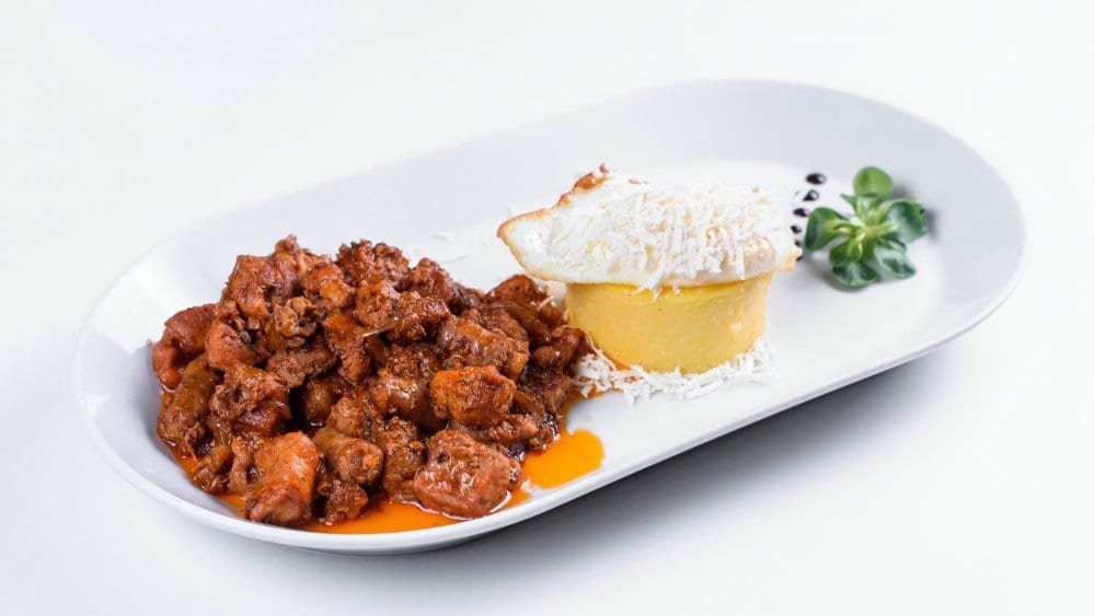 Carne porc, cârnați proaspeți, ceapă, usturoi, sos tomat, mămăligă, brânză, ou 500 g