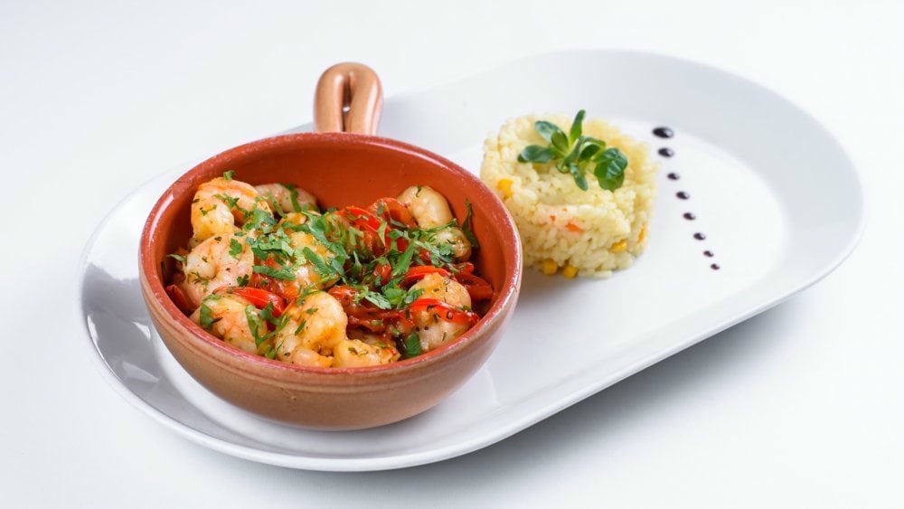 Creveți, roșii cherry, usturoi, pătrunjel, unt, ardei iute , servit cu orez cu legume 250 g
