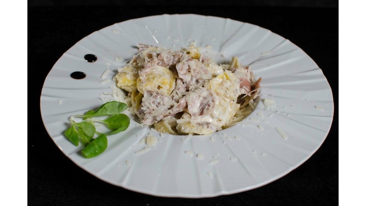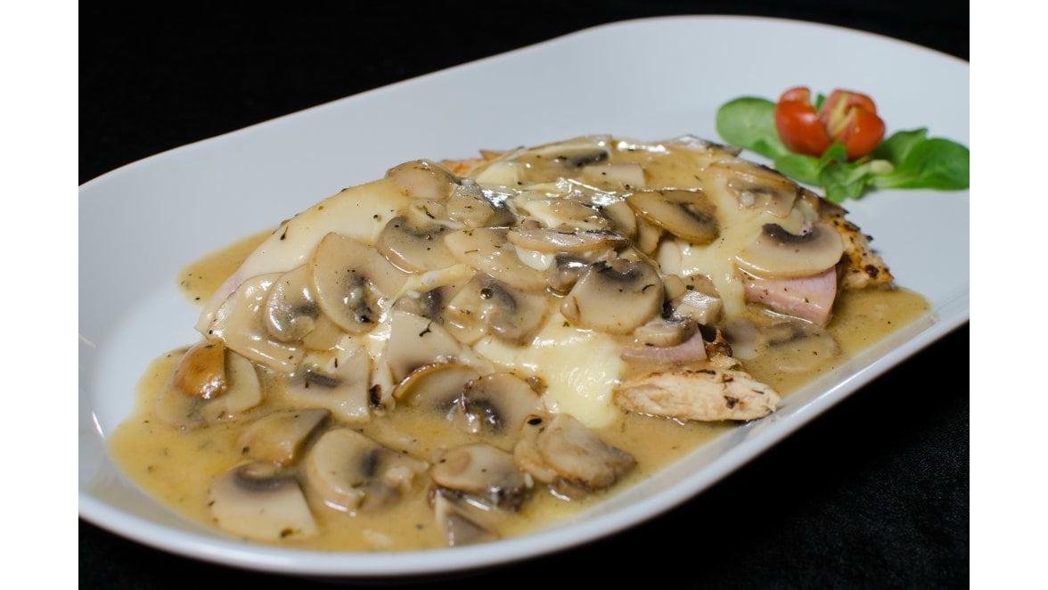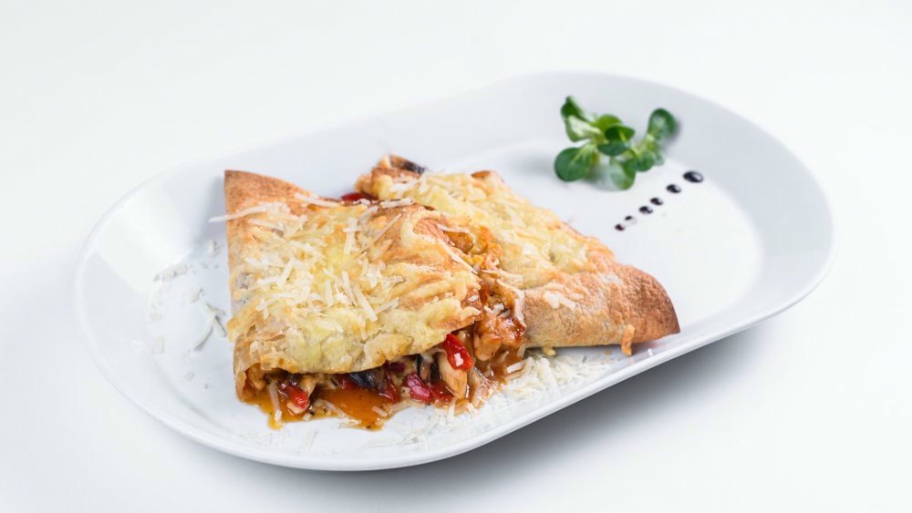 Piept de pui, mozzarella, tortillia, ciuperci, ardei gras, sos brun 450 g