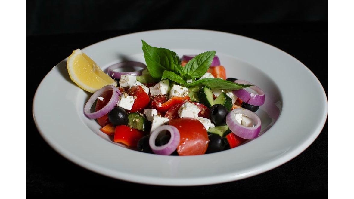 Salată verde, roșii, castraveți, ardei gras, măsline, oregano, brânză feta 400 g