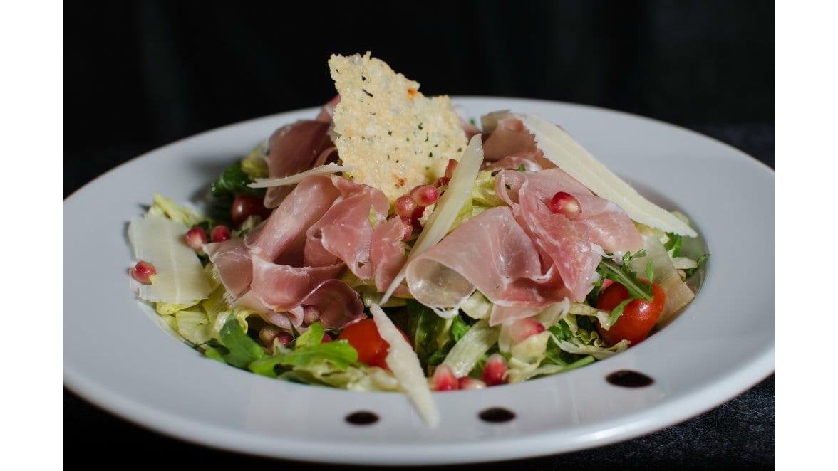 Salată iceberg, roșii, prosciutto crudo, parmesan, rodie, crutoane 400 g