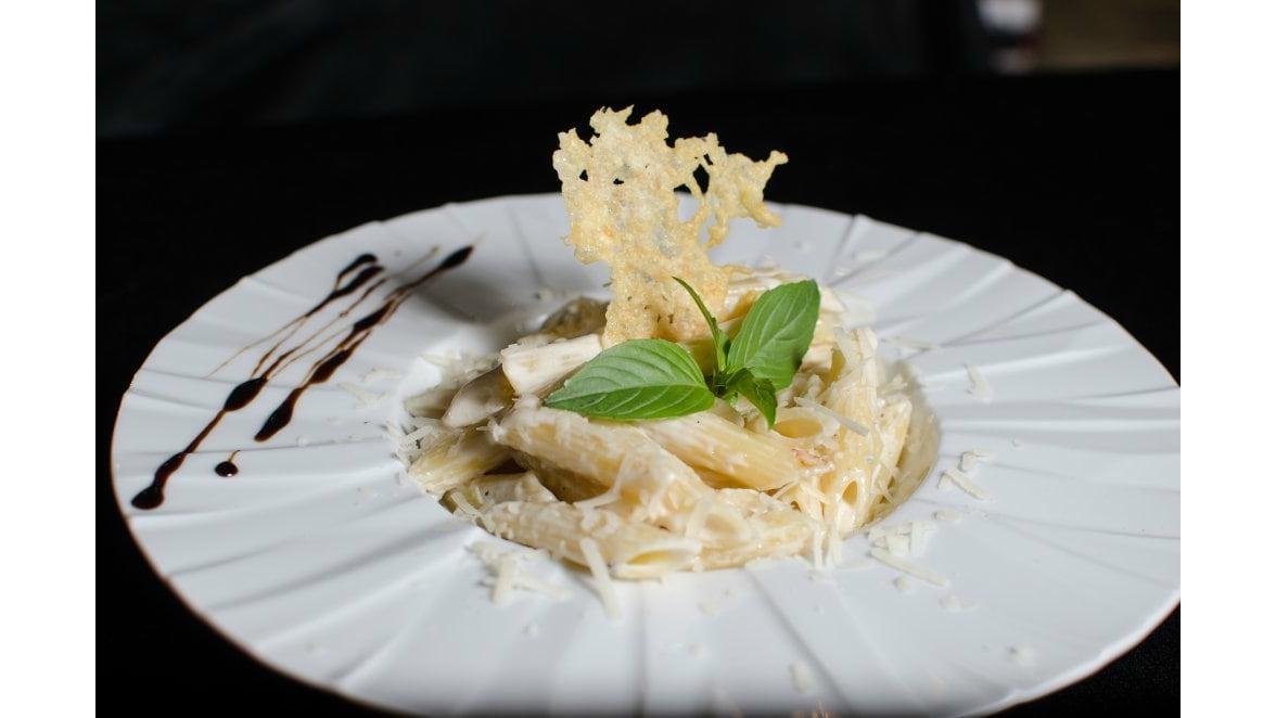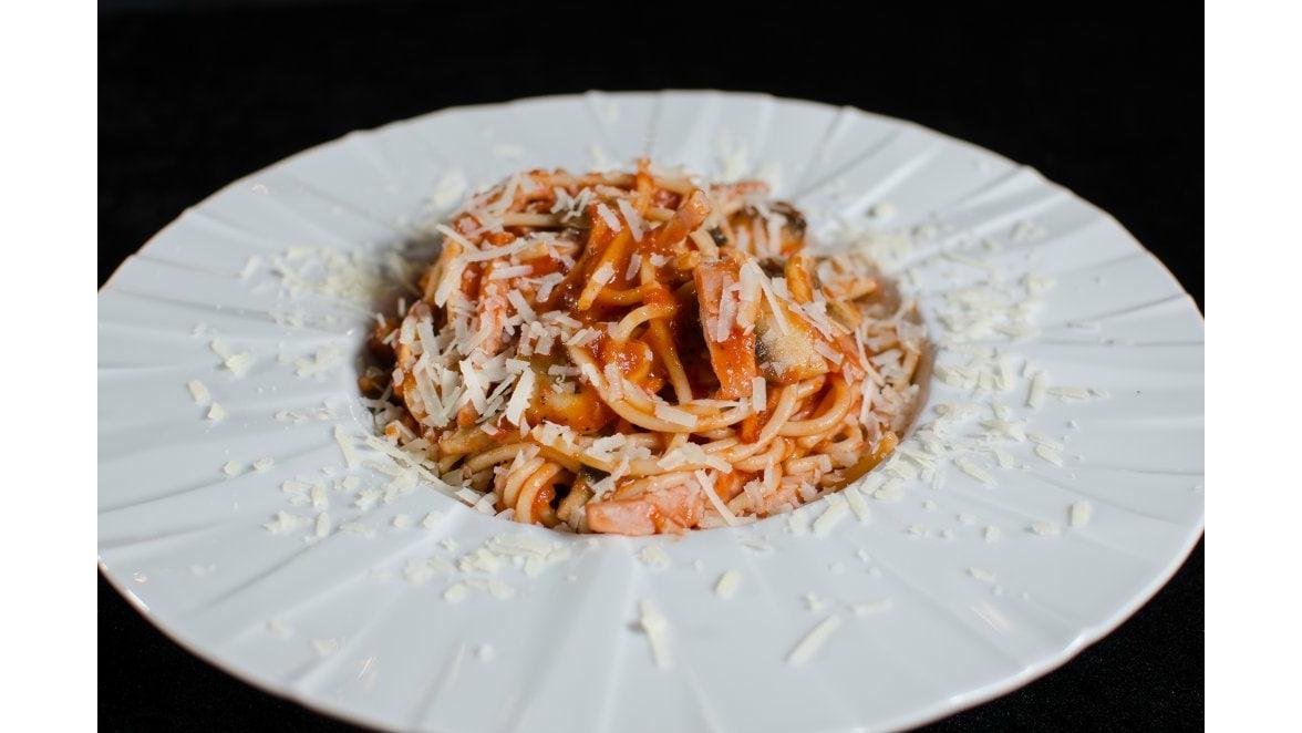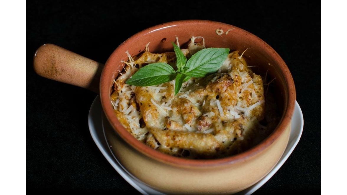 Penne, pulpă de vită tocată,carne de porc tocată, sos tomat, mozzarella, parmesan 430 g