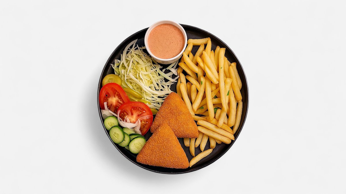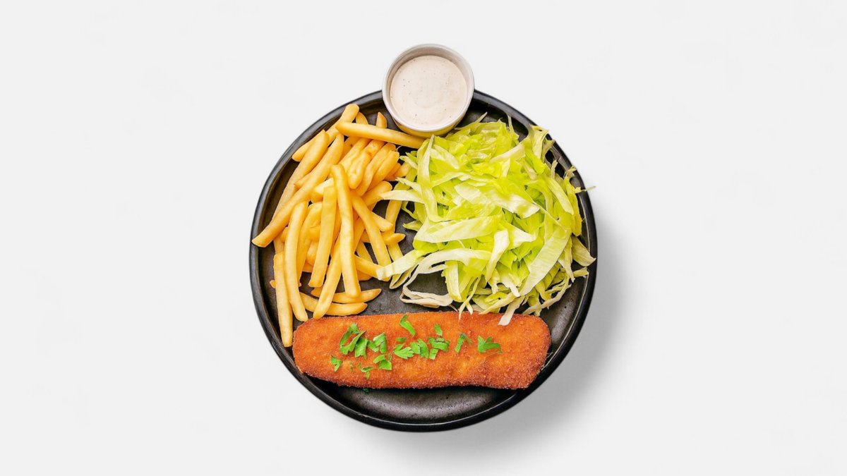 cascaval pane* 160gr, garnitura 150gr, salata 150gr, sos 50gr (* produse congelate) - 510gr