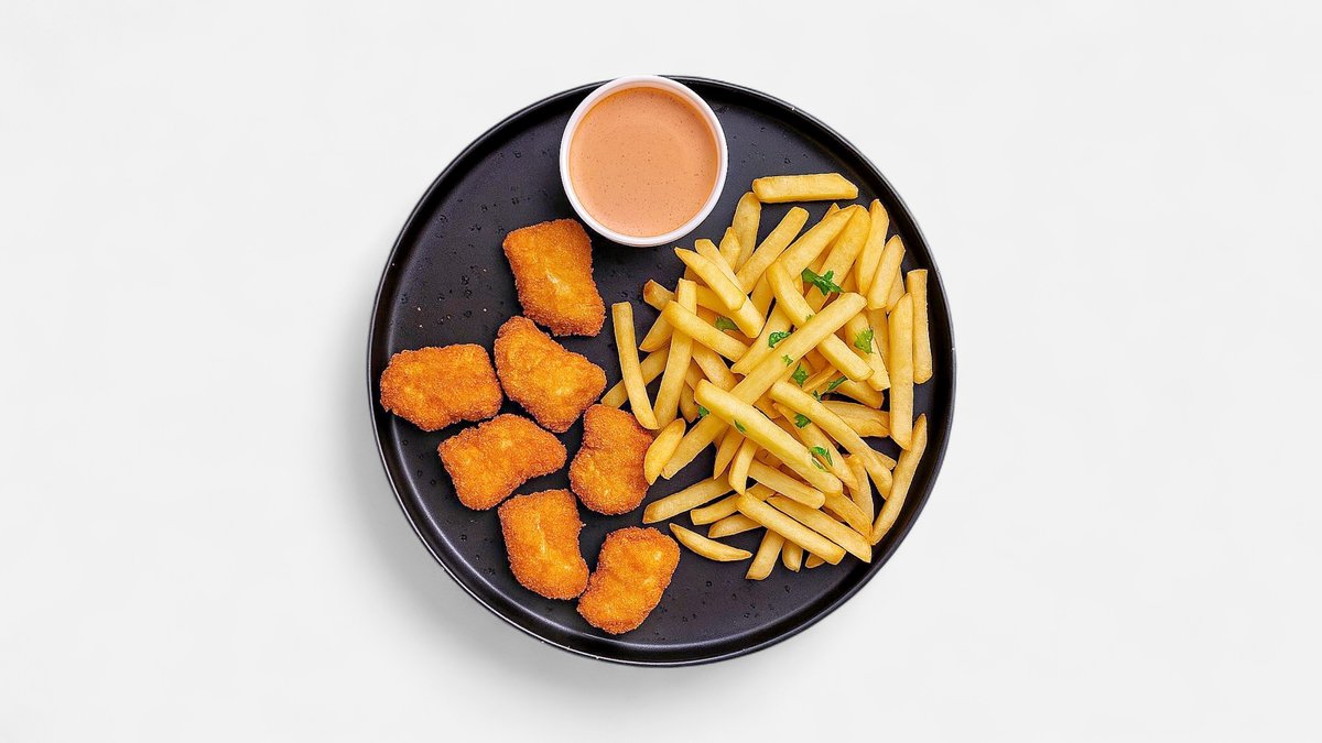 nuggets pui* 150gr, garnitura 150gr, sos 50gr (* produse congelate) - 350gr