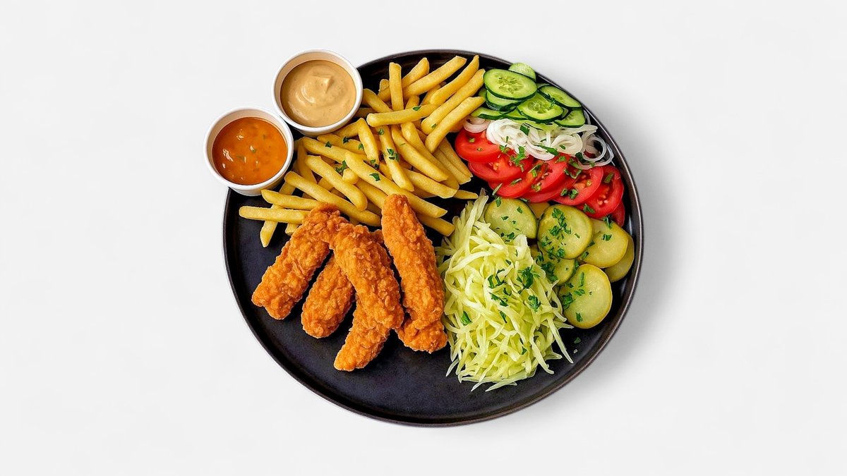 snitel pui* 150 gr, garnitura 150gr, salata 200gr, sos 2x50gr, pita* 100gr (* produse congelate)- 700gr