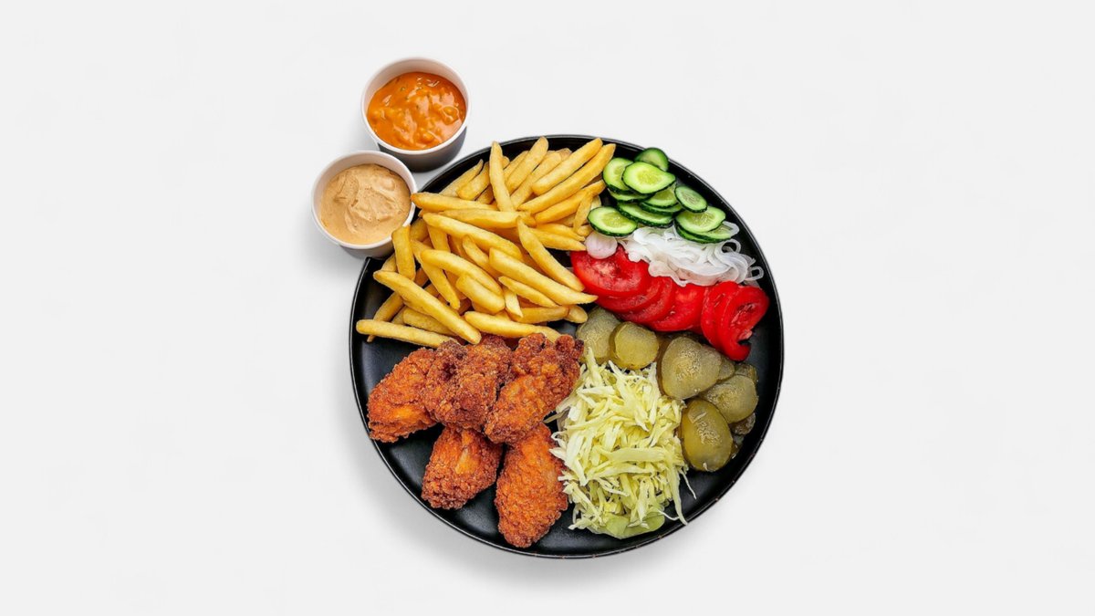aripioare de pui* 200 gr, garnitura 150gr, salata 200gr, sos 2x50gr, pita* 100gr (* produse congelate) - 750gr