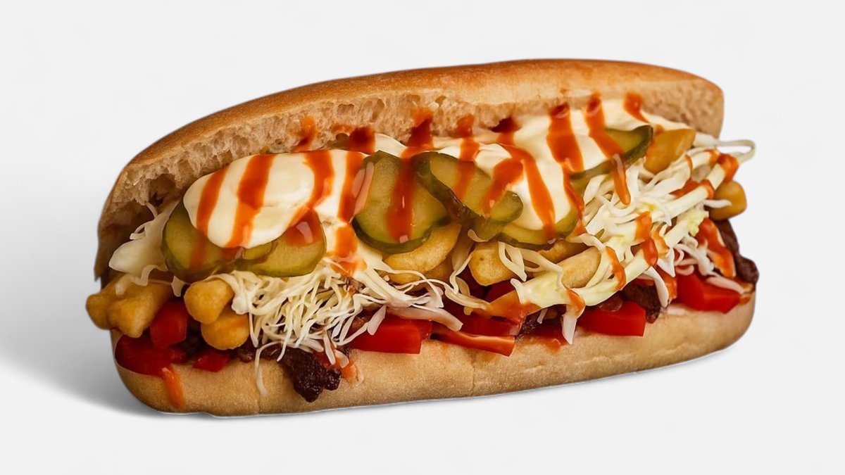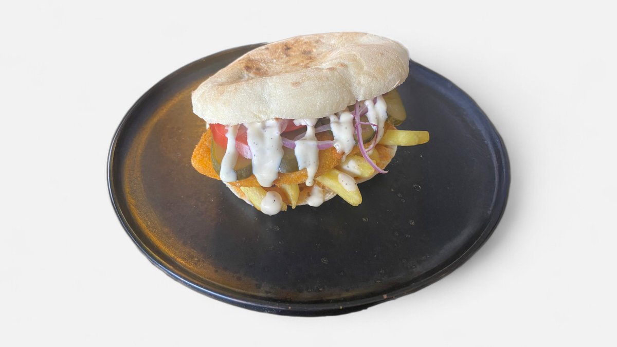 pita*120gr, pulpa porc sous vide 100gr, cartofi prajiti* 50gr, castraveti murati 50gr, sos M&M (maioneza & mustar), sos BBQ (*produse congelate) - 350gr