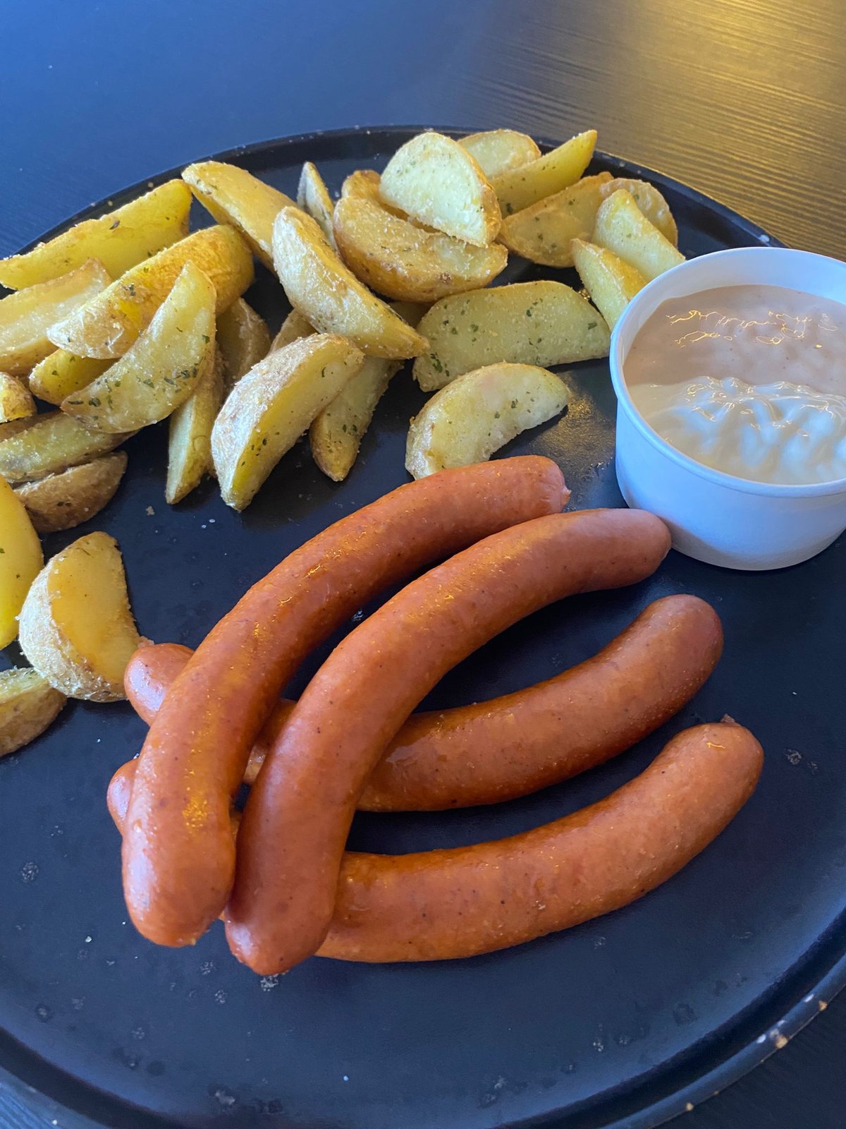 virsli porc - 4buc 160gr, pita* 100gr, cartofi pai 150gr, sos M&M 50gr