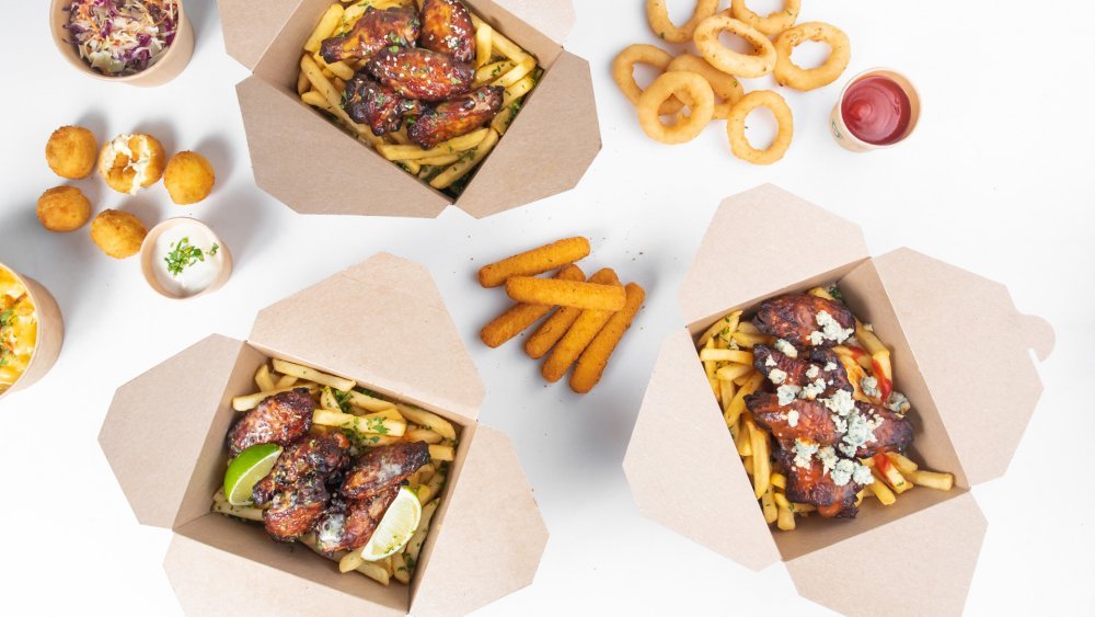 5 aripioare pui panetate 200g, sos barbeque si sriracha 50g, cartofi prajiti 180g, salata varza 100g, total cca 480g, 6E, din produs congelat Valori nutritionale/portie Valoare energetica: 899 Kcal (3761 kj), Grasimi 40.5g, acizi saturati 8g , glucide 85g:, zaharuri 10g, proteine 31.5g, sare 7g, E450, E500, E621, E160c, E415, E202 Alergeni: telina, gluten