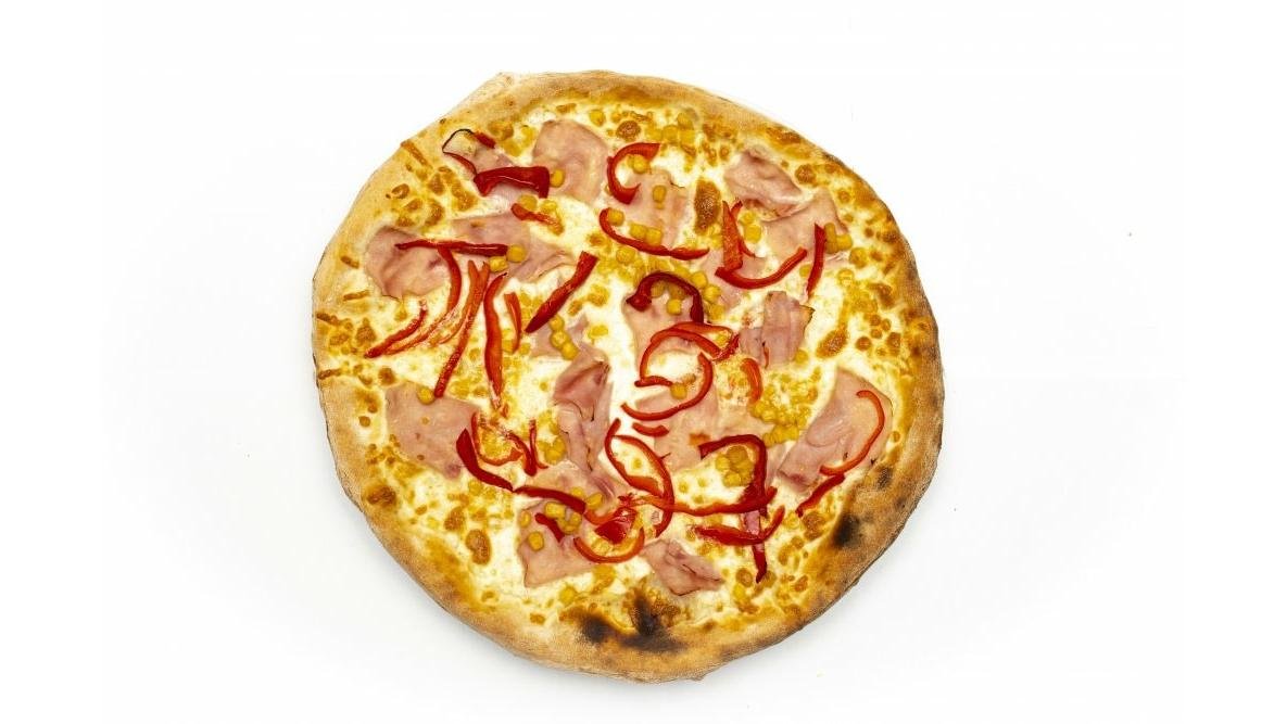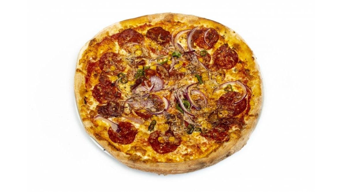 Sos roșii, mozzarella, parmezan, salam chorizo, prosciutto crudo, ardei iute, porumb, ceapă roșie, oregano 550 g