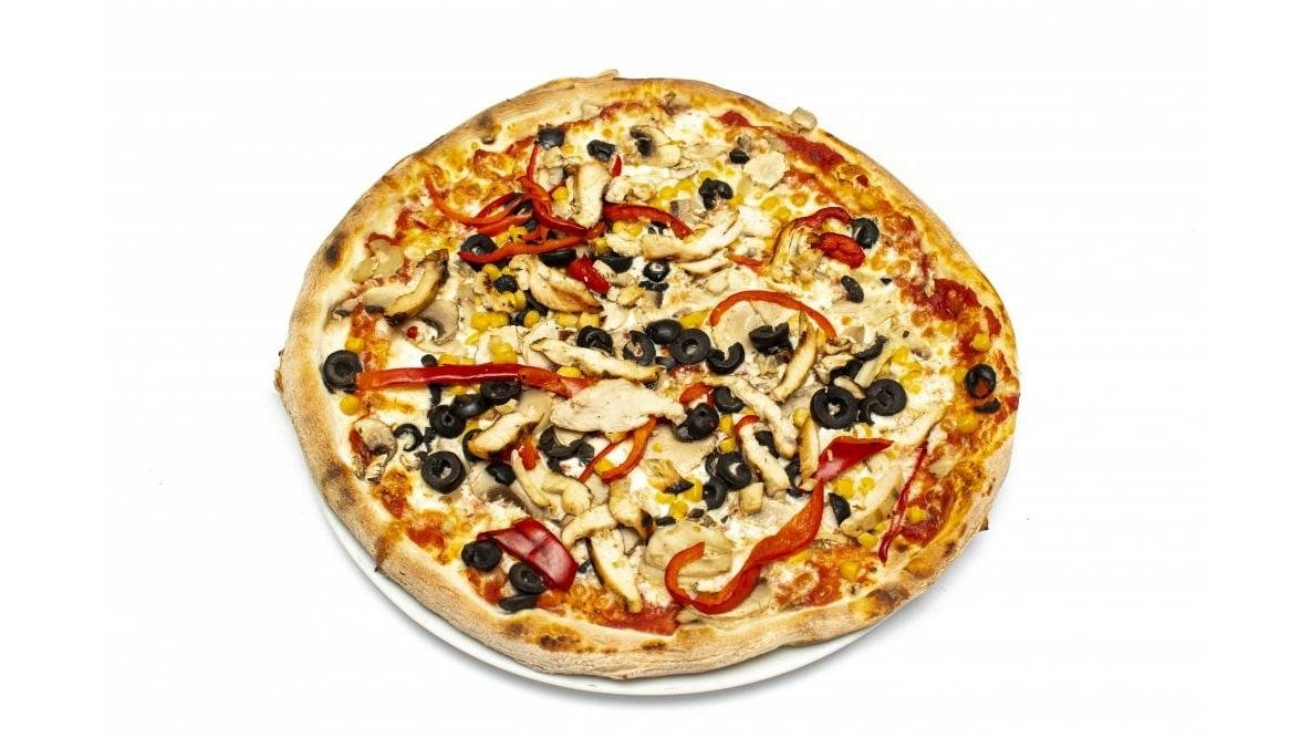 Sos de roșii, mozzarella, piept de pui, ciuperci, ardei gras, porumb, măsline 540 g