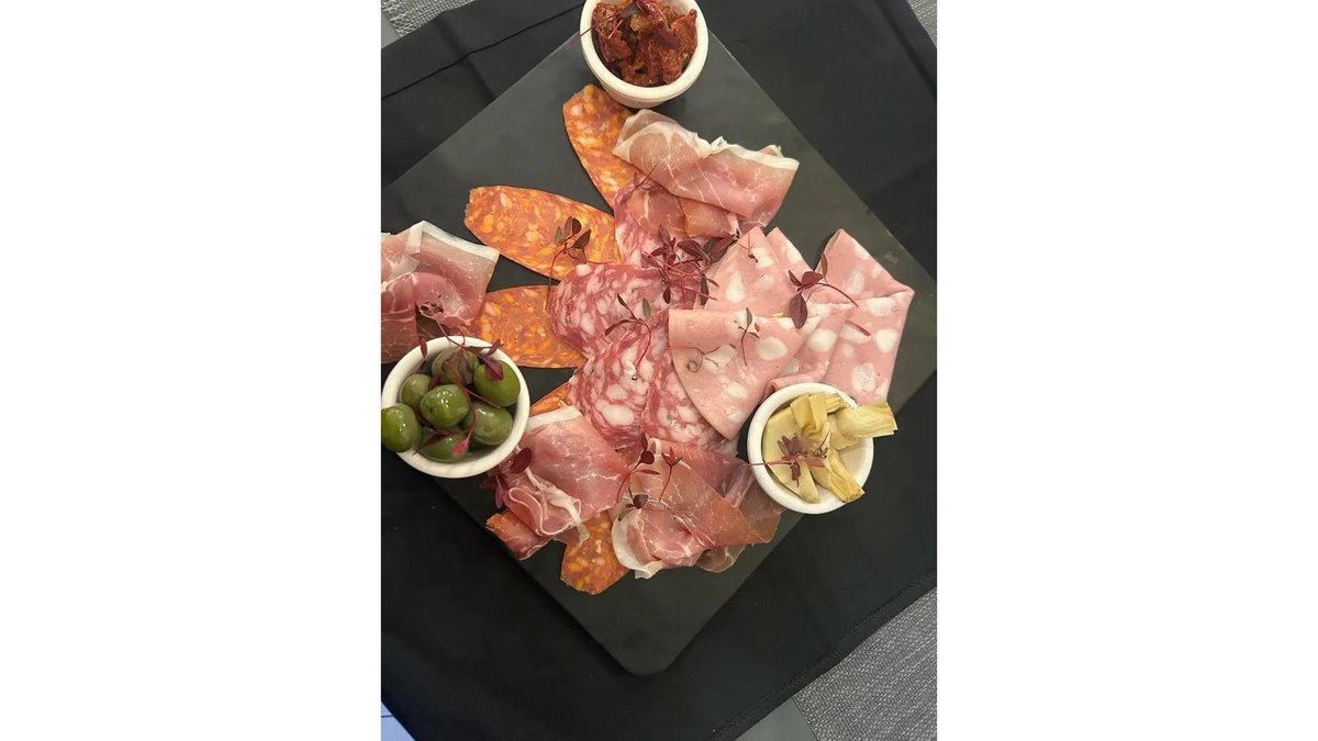 mortadella 80g, salam napoli 80g, prosciutto crudo 70g, salam picant napoli 60g, masline verzi siciliene 50g, anghinare 40g, ciuperci murate 30g 440g
