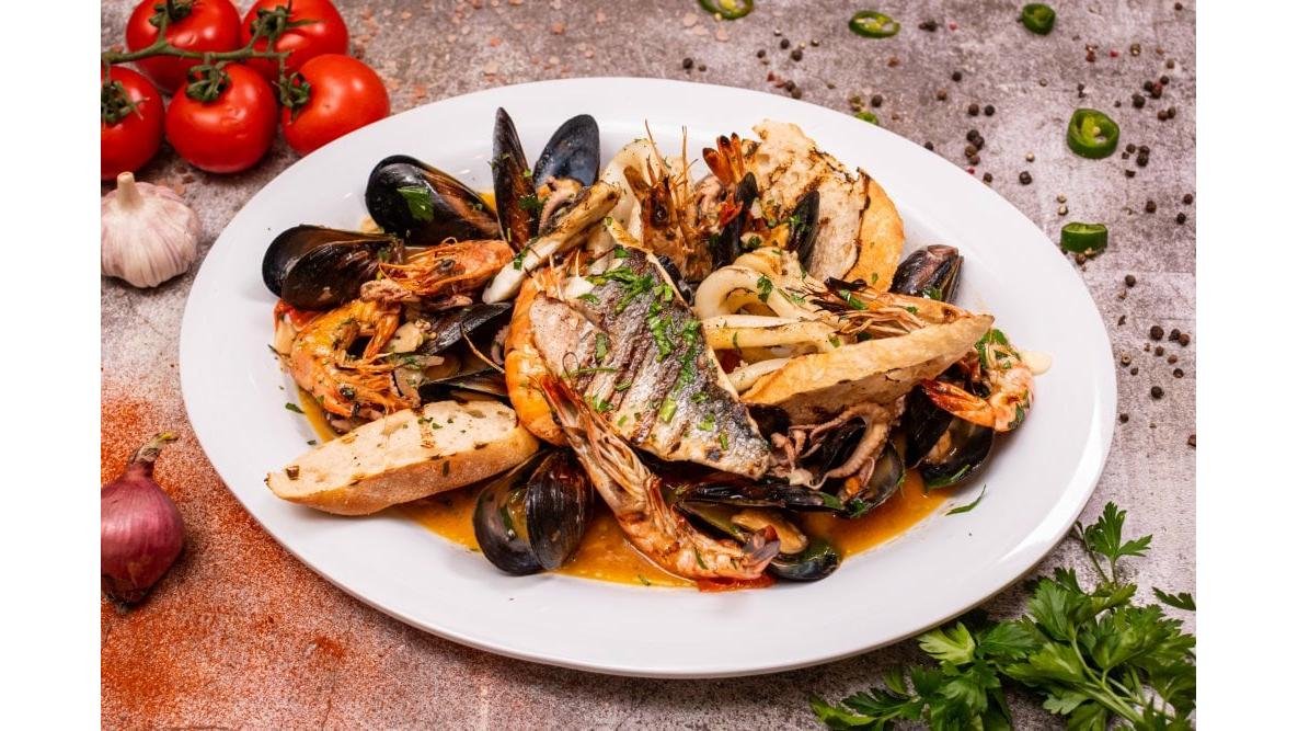 mix de fructe de mare*100g(crustacee, moluste)(creveti, midii, caracatita, calamar tub, vongole), cartofi 60g, lamaie 30g, telina apio 20g, usturoi, ulei de masline virgin, patrunjel, sare, piper 250g