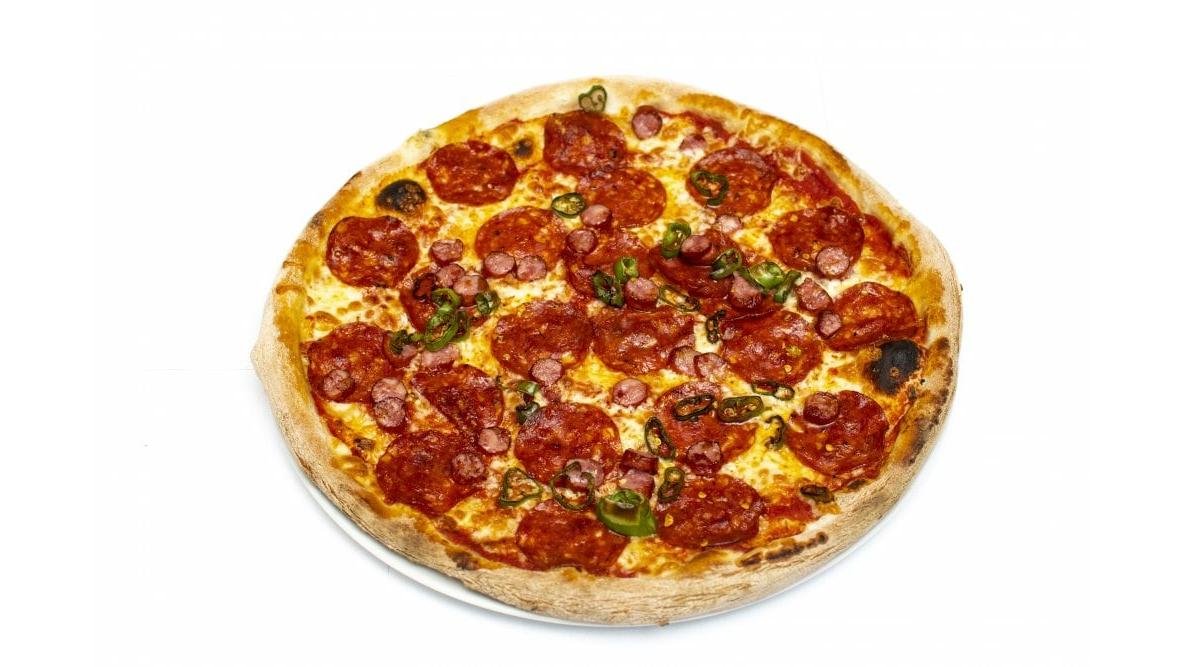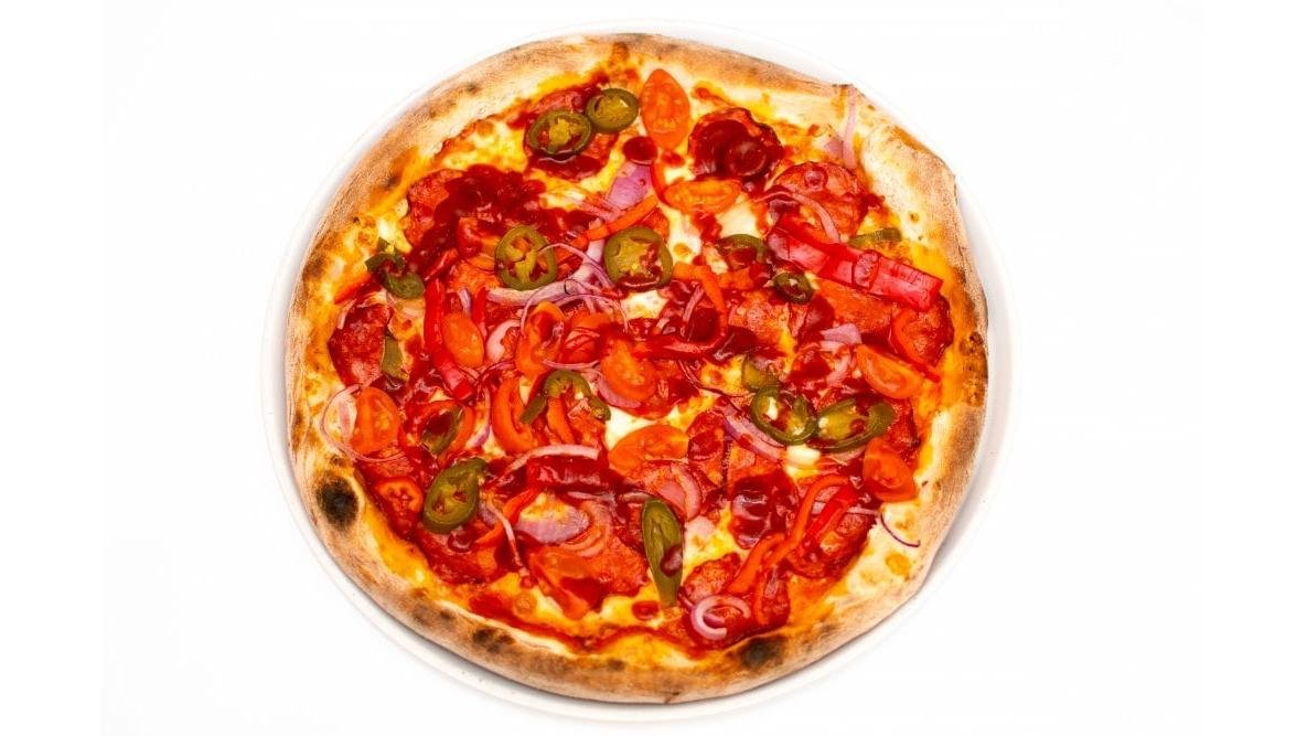 Sos de roșii, mozzarella, salam chorizo,roșii cherry, ardei kapia, ceapă roșie, jalapenos, sos samourai, aluat 500 g