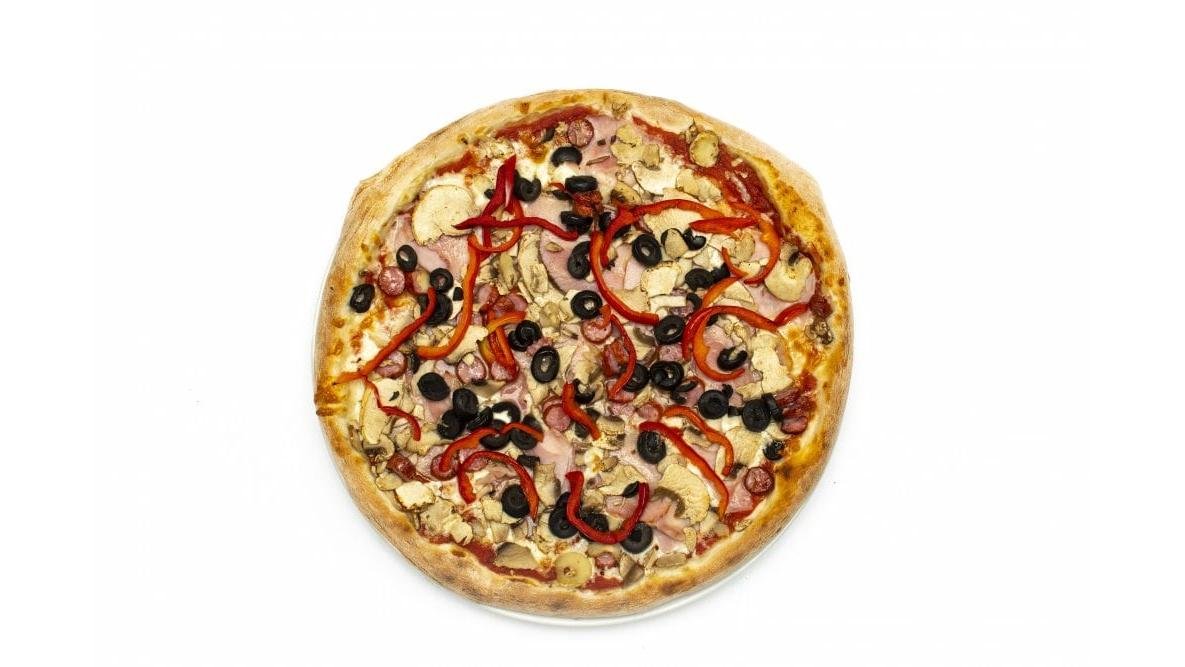 Sos de roșii, mozzarella, șuncă, salam chorizo, ciuperci, măsline 650 g