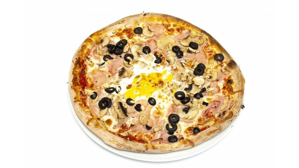 Sos roșii, mozzarella, șuncă, ciuperci, măsline, ou 620 g