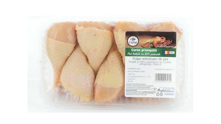 Pulpe inferioare de pui furajat cu 60% porumb, cu os si piele, refrigerate, Clasa A.