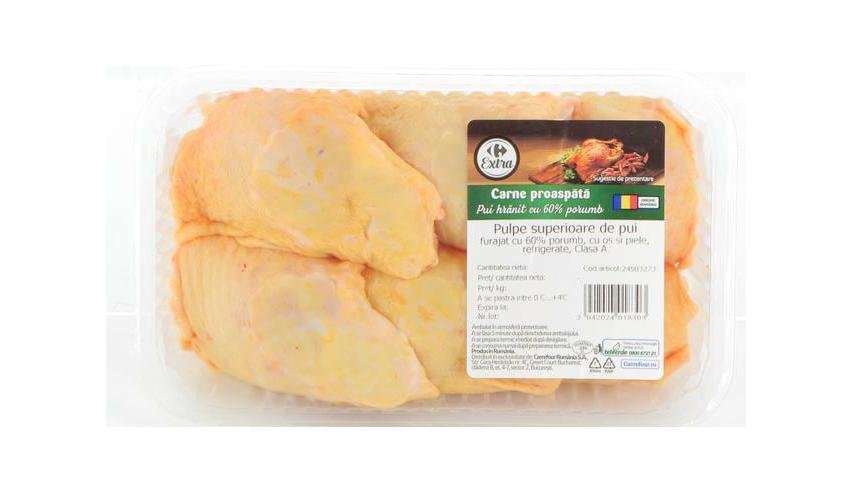 Pulpe superioare de pui furajat cu 60% porumb, cu os si piele, refrigerate, Clasa A.