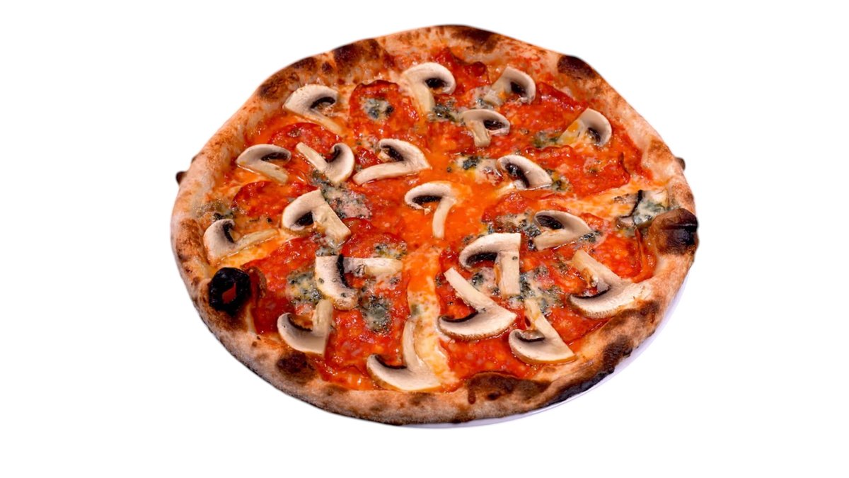 450g, sos de rosii, mozzarella, salam picant, blue cheese, ciuperci