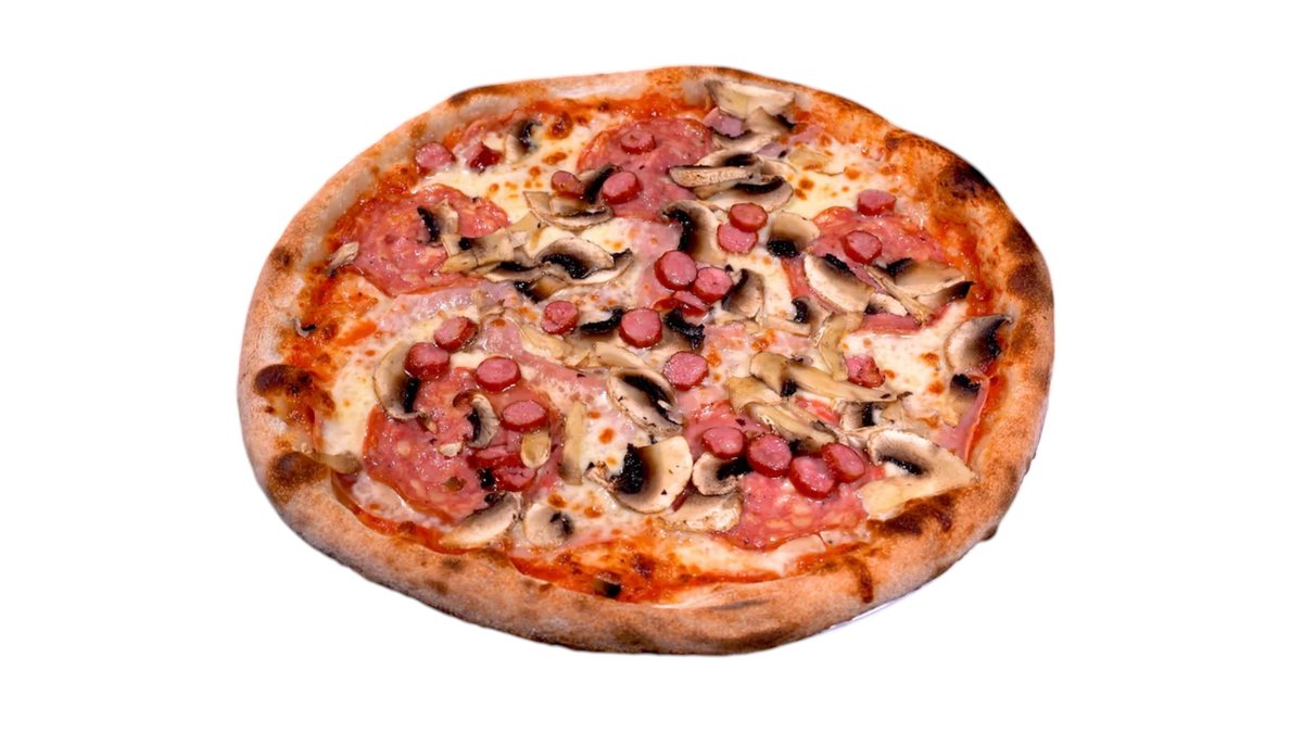 450g, Tomato sauce, mozzarella, prosciutto cotto, champignon mushrooms (450g).