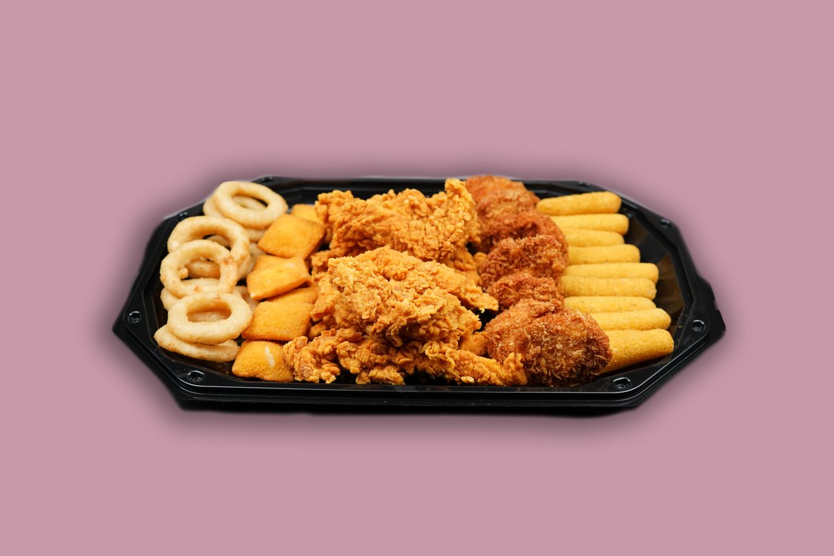 4 crispy, 10 mozzarella sticks, 8 aripioare, 12 inele de ceapa, 2 portii de cartofi prajiti proaspeti si 1 salata coleslaw si 1 sos la alegere - 1.5kg