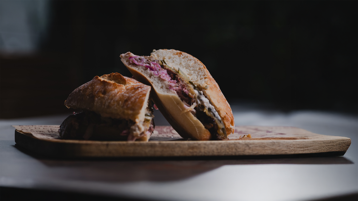 Ciabatta, brisket, ceapă caramelizată, cornichons, salată coleslaw. Garnitura nu este inclusă. Ciabatta, brisket, caramelized onions, cornichons, coleslaw. Side dish not included. 350g