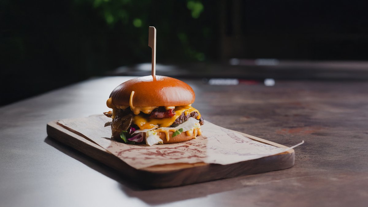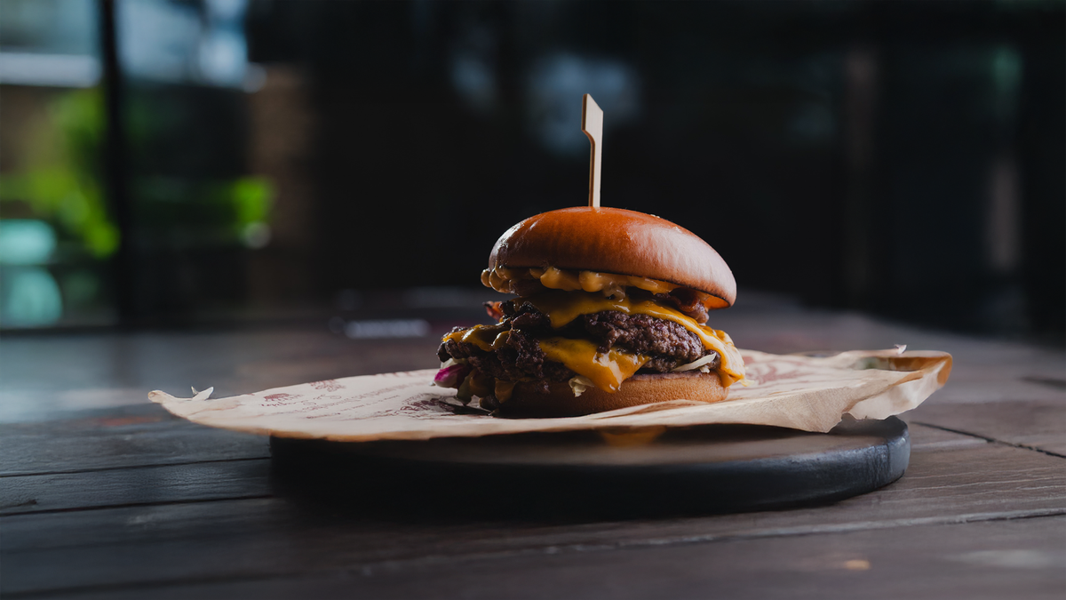 Chiflă burger, carne vită black angus smashed, ceapă caramelizată, cheddar, pancetta, sos burger, unt, salată. Garnitura nu este inclusă. Burger bun, smashed Black Angus beef patty, caramelized onions, cheddar, pancetta, burger sauce, butter, salad. Side dish not included. 250g