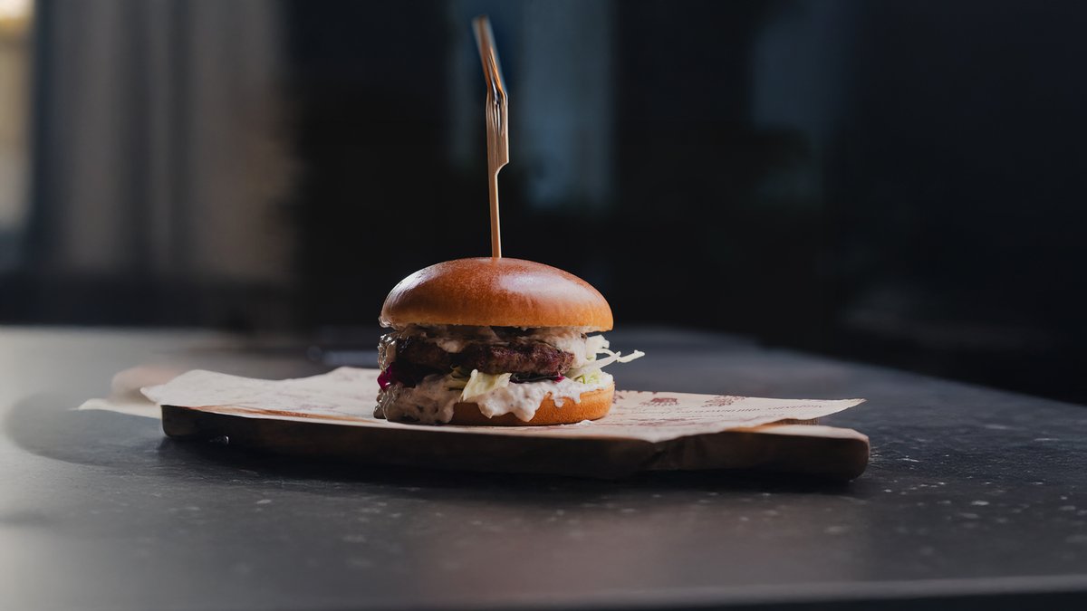 Chiflă de burger, carne de vită Black Angus, cheddar, ou, pancetta, salată, sos tartar. Garnitura nu este inclusă. Burger bun, Black Angus beef, cheddar, egg, pancetta, lettuce, tartar sauce. Side dish not included. 350g