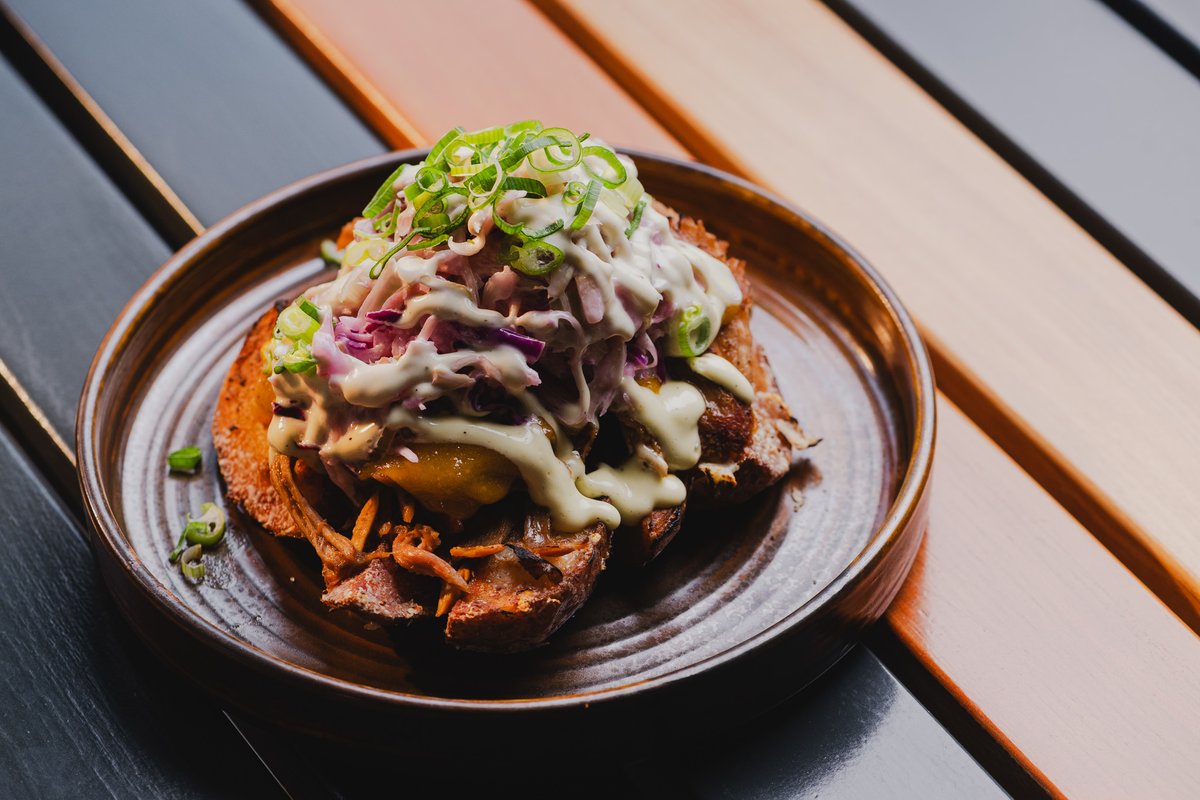 Pulled pork gătit lent în smoker american, cu gust intens și textură fragedă. Vine cu cartofi copți, coleslaw crocant, sos aioli și ceapă verde. Un bol de confort autentic, cu rădăcini în barbecue-ul adevărat. 100 gr/ 200 gr/ 10 gr/ 100 gr / 30 gr