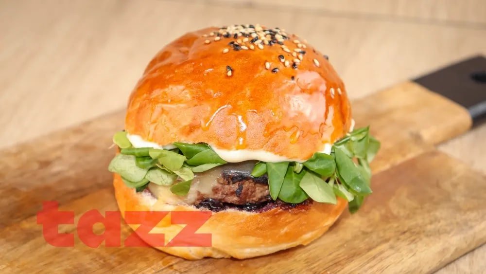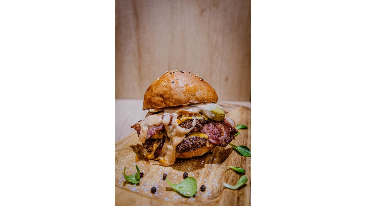 Chiflă artizanala120 gr, ceapă la grill 20gr, 2 buc carne de vită 2× 130 gr, sos cocktail 40 gr, castraveți murați 20 gr, 2 felii Cheddar 2×20gr, bacon