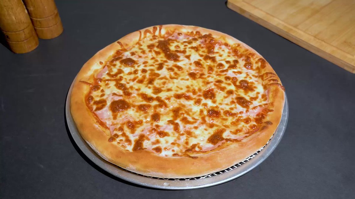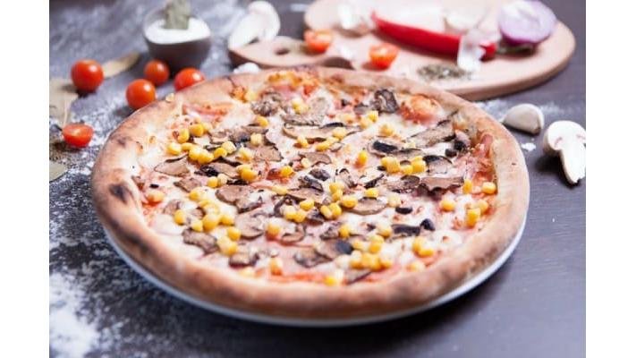 Sos de roșii, mozzarella, salam, șuncă, ciuperci proaspete, măsline, porumb