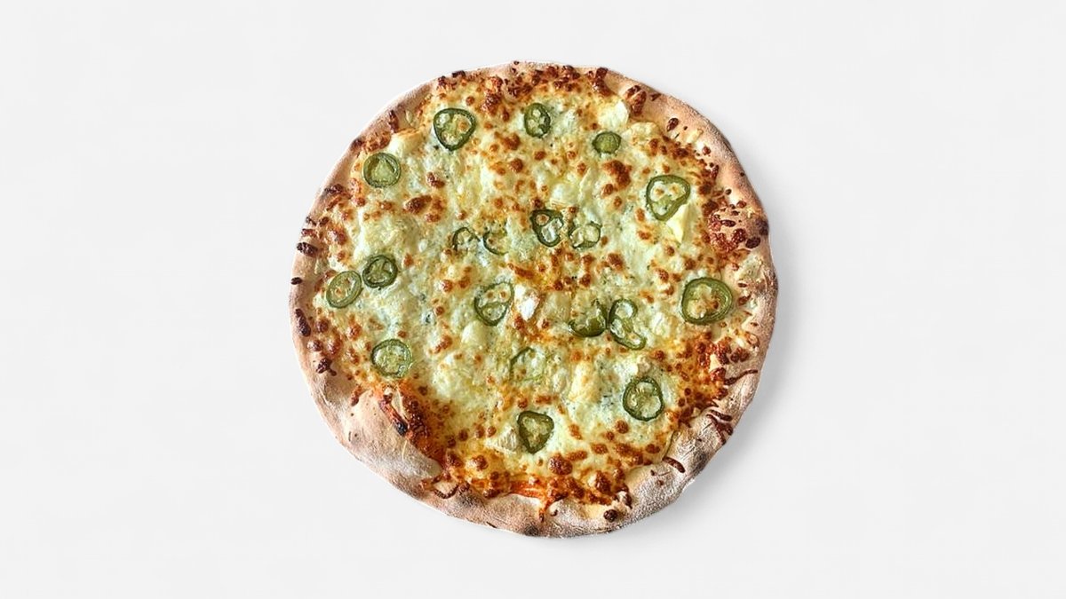 Sos alb cu smântână și usturoi, mozzarella, șuncă afumată 100% carne, bacon, ciuperci proaspete, parmezan, ardei iute Jalapeños 800 g *Poză cu titlu de prezentare