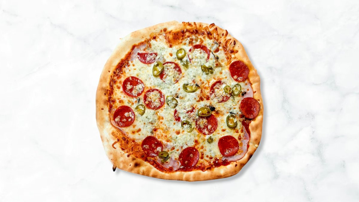 Sos de roșii cu chilli Cayene, mozzarella, prosciutto cotto, salamPepperoni, ciuperci proaspete, gorgonzola, ardei iute Jalapeños 700 g *Poză cu titlu de prezentare