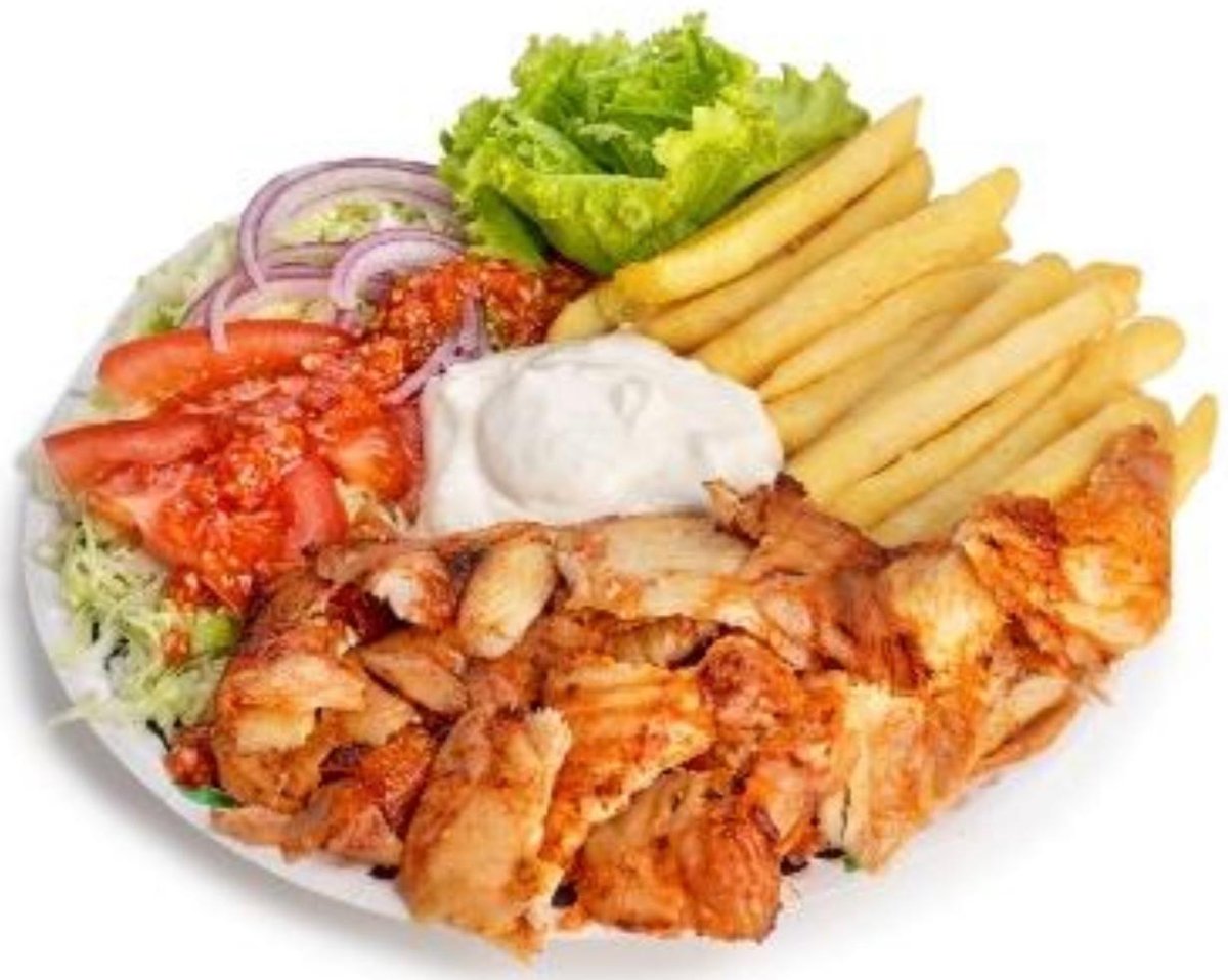 Gramaj 630g din care: Carne rotisată de puisor 120 g, cartofi prăjiți 120 g, salată de varză 120 g, roșii 15 g, ceapă 10 g, castraveciori murați în saramură sau oțet 15 g, salată verde 10 g, sos usturoi 40 g, sos dulce-acrișor 20g, sos legume 20 g, sos tzatziki 20 g,pita 120g