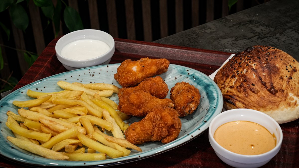 Ingrediente: cartofi, 6 buc nuggets, chifla sau lipie, 2 sosuri la alegere, o salata de varza (400g)