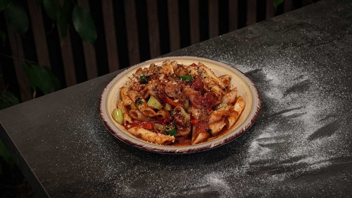 Penne, carne tocata de vita, ceapa, ardei kapia, usturoi, rosii, grana padano 300g