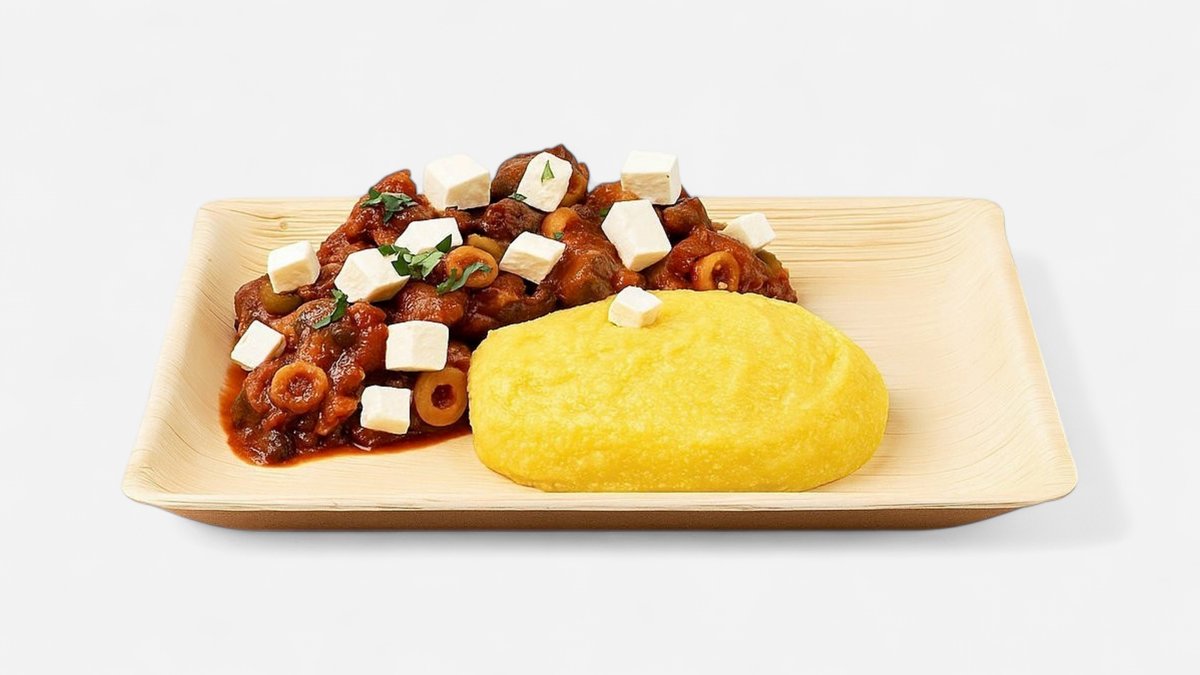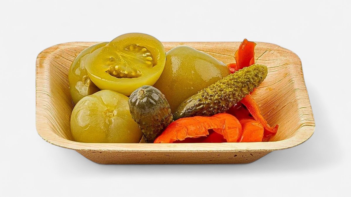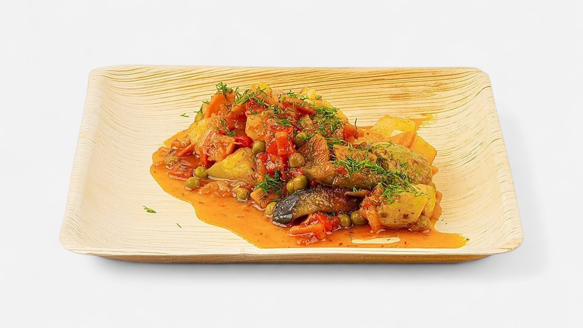 ( Morcovi:40g, Dovlecei:40g, Ceapa:40g, Cartofi:80g, Mazăre*:40g, Usturoi: 5g, Sos de rosii:40g, Vinete:40g, Păstârnac:40g, Ulei:10g, Sare:3g) 350 g