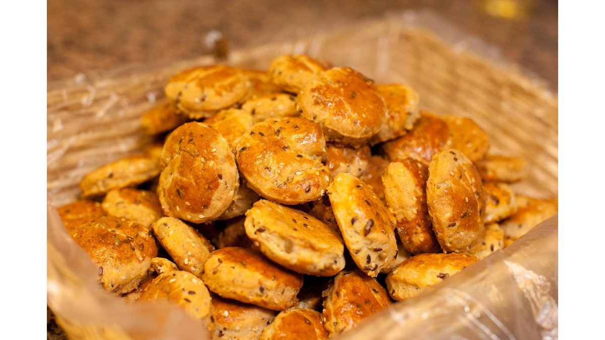 Făină albă moară naturală, apă, semințe în, semințe floarea soarelui, chimen, brânză de vaci 0,5%, ouă, praf de copt, sare 150g