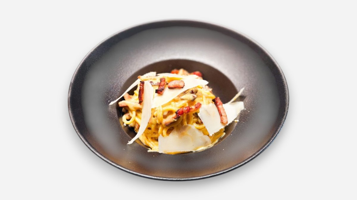Spaghetti, sos carbonara (galbenus de ou, pecorino, grana padano, sare, piper), guanciale, pancetta. - 400g