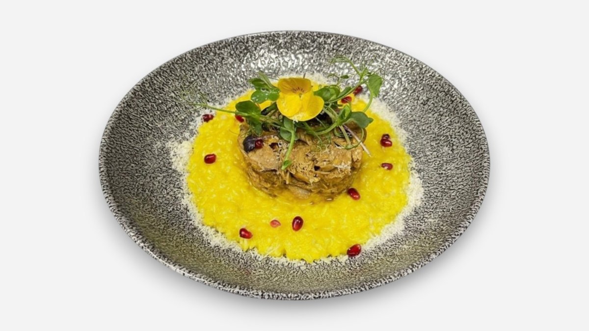 Orez carnaroli, carne iepure, unt 82%, grana padano, ulei floarea soarelui, boabe de cafea, ulei de masline extravirgin, ceapa, sofran, chimen, curcuma, curry, usturoi, boia de ardei, sare, piper.