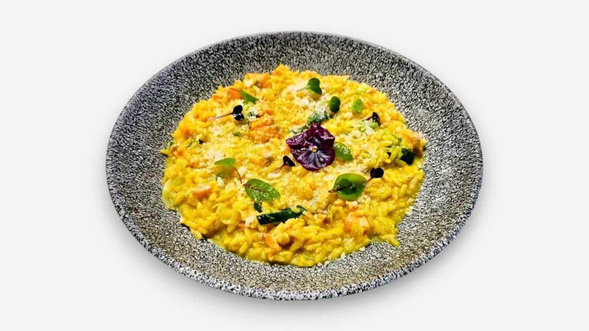 Orez carnaroli, ceapă, supă de pui (rădăcinoase, legume, apă, ierburi aromatice, oase de pui), șofran, unt și parmezan-450g