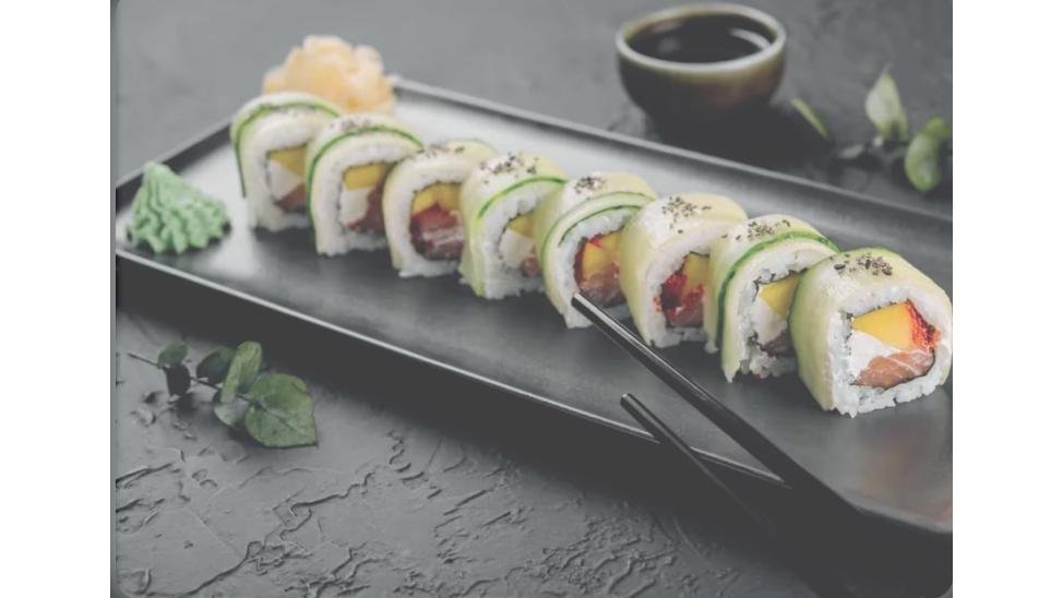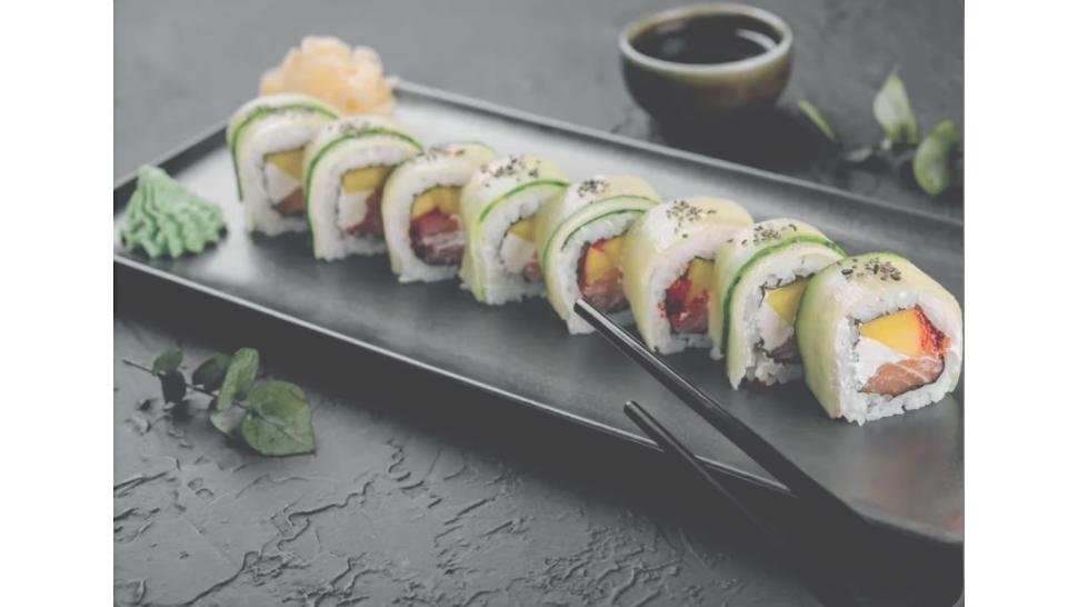 Somon, mango, cremă de brânză, castravete, tobiko. 8 buc 240 g