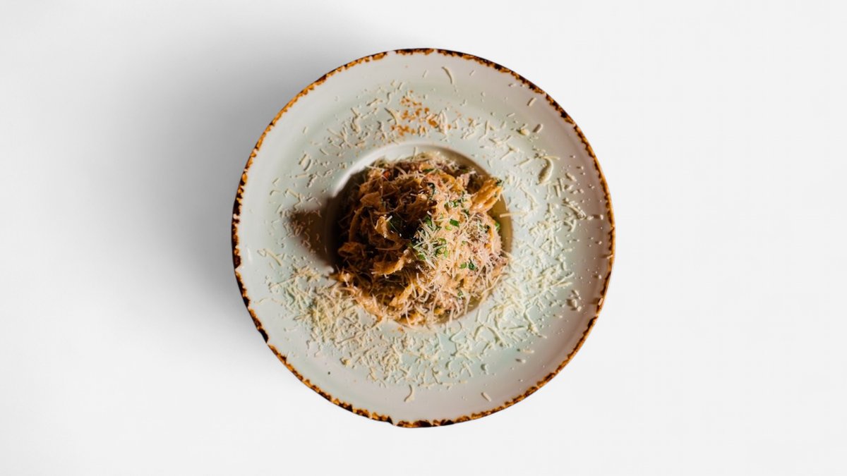 Tagliatelle proaspete, mușchi de vită, grana padano, dovlecel, usturoi, roșii cherry, pătrunjel, tartufata, cremă vegetală, unt, vin alb, sare, piper 400g