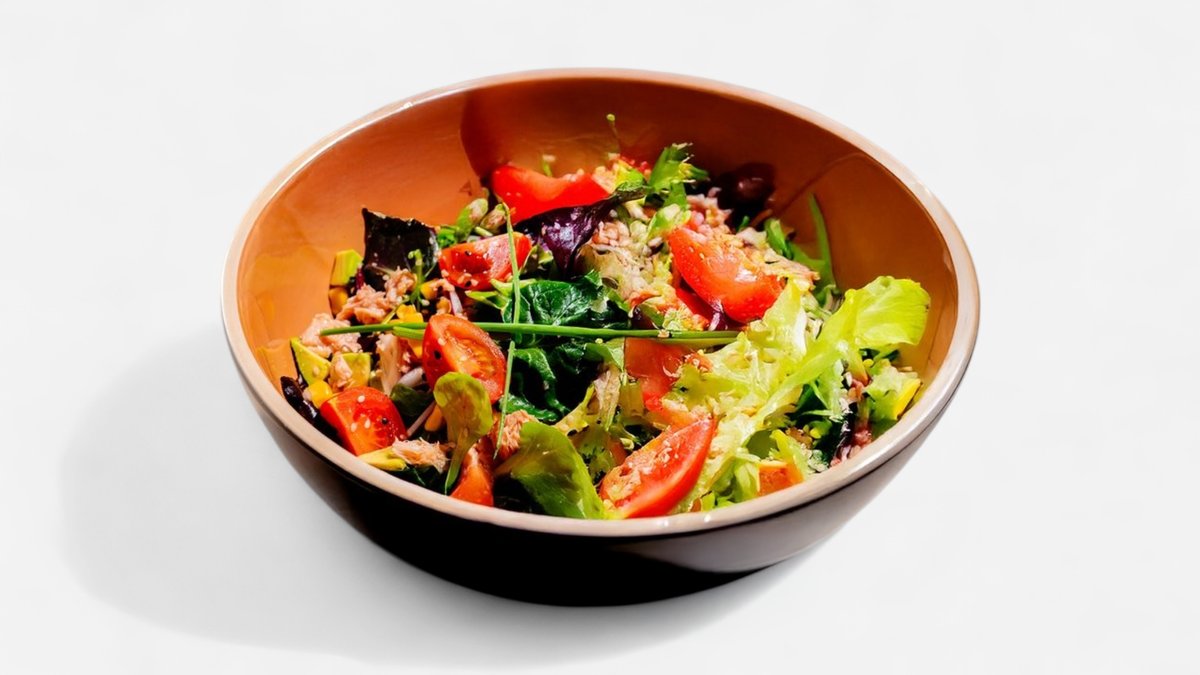 Mixuri de salate, roșii cherry, avocado, ceapă roșie, porumb, lămâie, susan, ton conservă, sare, piper, ulei verde (pătrunjel, ceapă verde, busuioc, ulei de măsline, ulei de floarea-soarelui), dressing de citrice (portocală, lămâie, muștar, miere, ulei de măsline) 400g