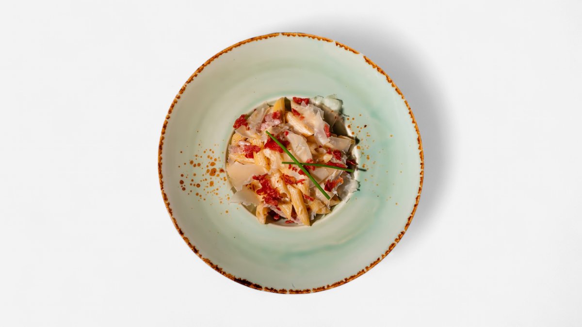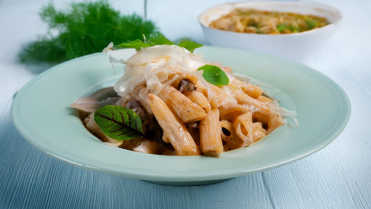 Penne proaspete, mușchi de vită, grana padano, cremă vegetală, sos quattro formaggi (cremă vegetală, grana padano, gorgonzola, blue cheese mix, brie, sare, piper) 400g