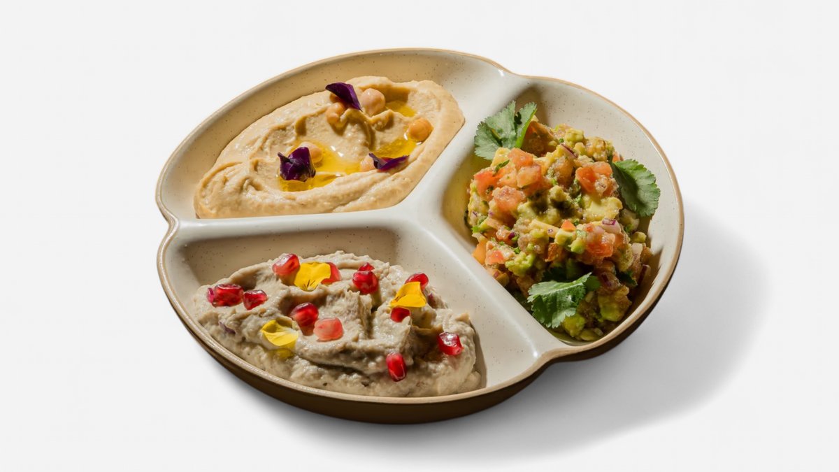 Hummus (năut uscat, pastă de tahini (susan), usturoi, ulei de floarea-soarelui, ulei de măsline extra virgin, sare), Guacamole (avocado, ceapă roșie, roșii, ulei de măsline extra virgin, coriandru, sare, piper, dressing de soia (susan, miere, ulei de măsline, cremă acetto balsamico)), cremă de vinete (vinete, pastă de tahini (susan), ceapă roșie, ulei de floarea-soarelui, sare), rodie, boabe de năut, ulei de măsline extra virgin, baghetă cu semințe 400g
