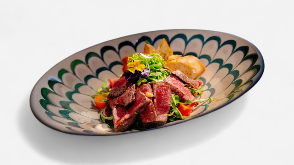 Mușchi de vită, salată rucolla, roșii cherry, grana padano, cremă acetto balsamico, unt, cimbru, rozmarin, ulei de măsline, usturoi, cartofi prăjiți cu parmezan, pătrunjel și usturoi (cartofi, pătrunjel, usturoi, grana padano, sare, ulei de floarea soarelui), baghetă cu semințe, sos cheddar (brânză topită cheddar, cremă vegetală, ardei iute, usturoi, sare, piper) 1200g