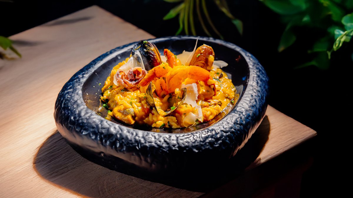 Orez arborio (ceapă, vin alb), creveți, calamar tub, roșii cherry, apio, usturoi, busuioc, ceapă verde, turmeric, unt, grana padano, ulei de floarea-soarelui, sare, piper, ulei verde (pătrunjel, ceapă verde, busuioc, ulei de măsline, ulei de floarea-soarelui) 400g