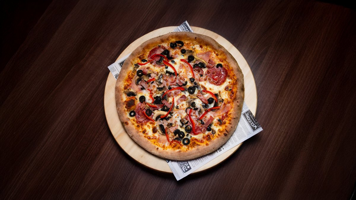 sos de rosii, mozzarella, sunca, salam, bacon, ciuperci, masline, ardei - 490g