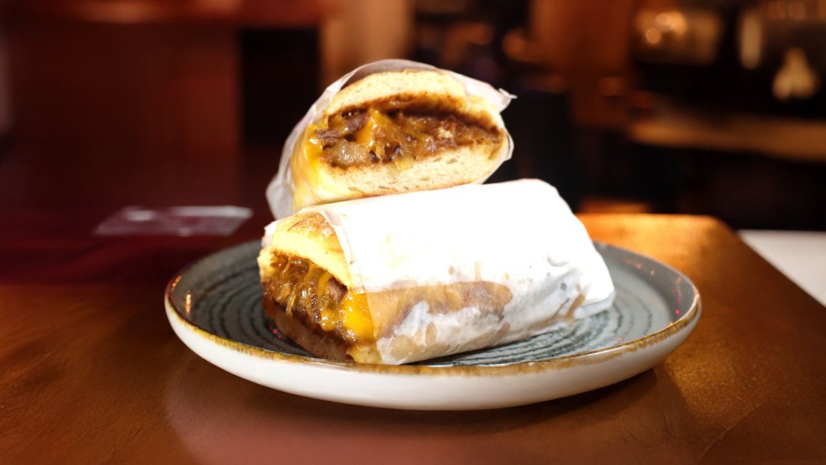 antricot de vita, chifla, ceapa, branza cheddar + cartofi prajiti - 350g